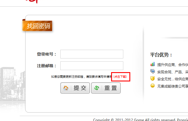 如果无法登陆ECP系统,可在ECP登录首页"忘记密码"点击下载,下载邮箱变更申请表;将申请表填写完成后盖章,将申请表发送到邮箱:gomeauthecp@gome.com.cn;