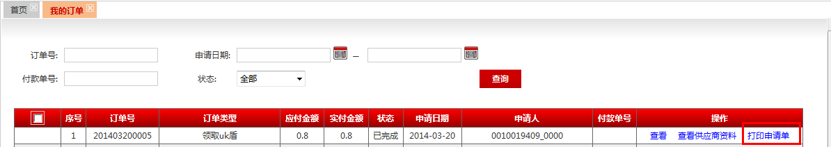 第一步:使用管理员账户登录ECP系统我的订单后【打印】按钮,打印申请表;