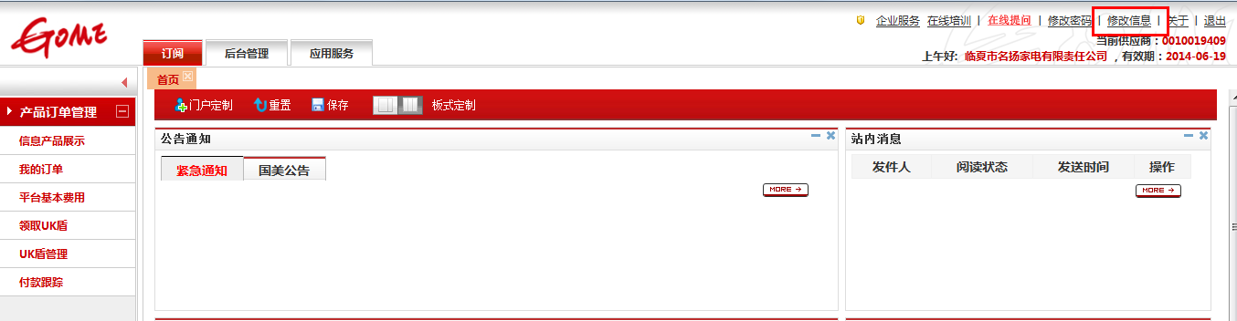 如果可正常登陆进去ECP系统,可点击右上角【修改信息】修改管理员邮箱;